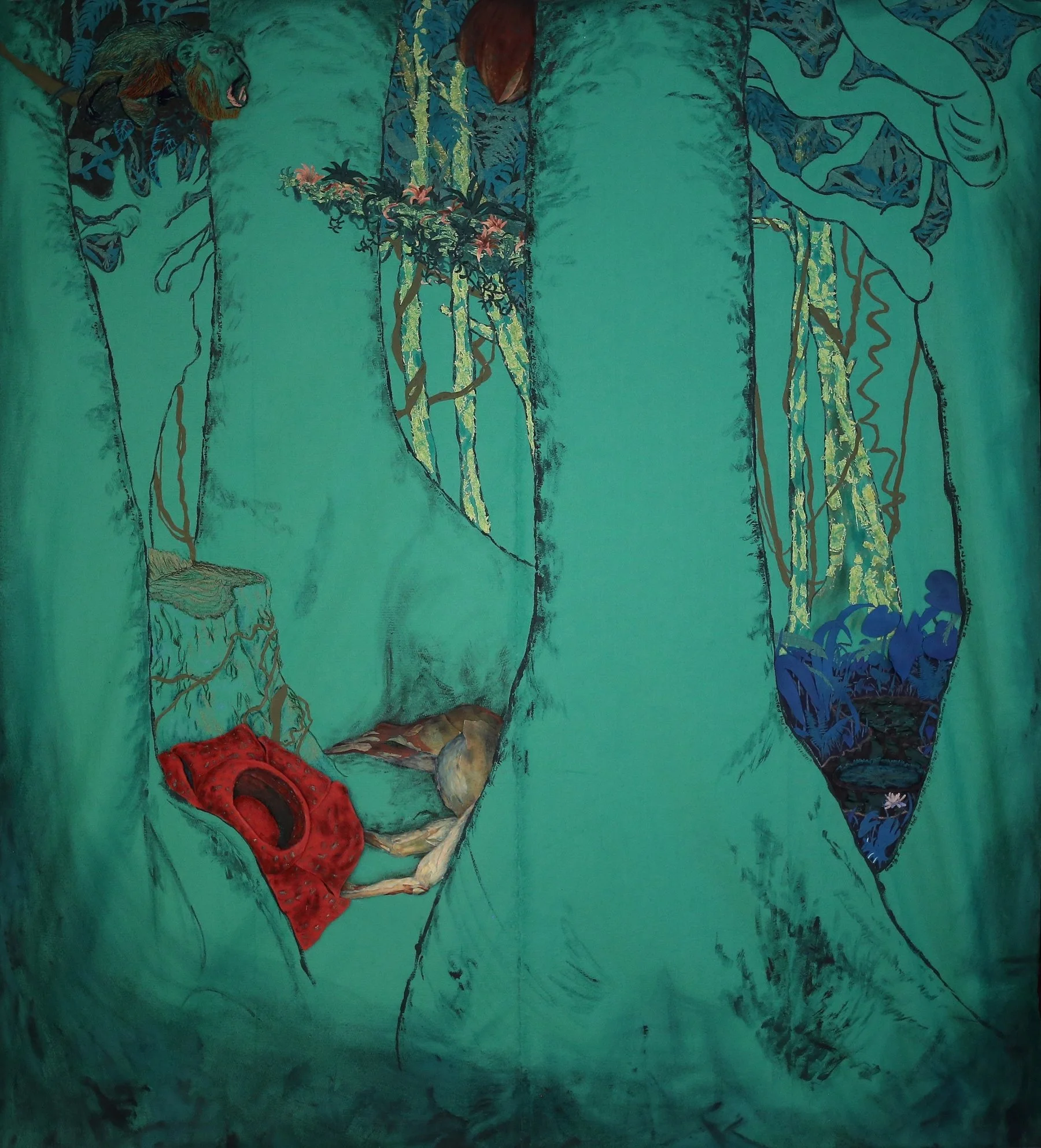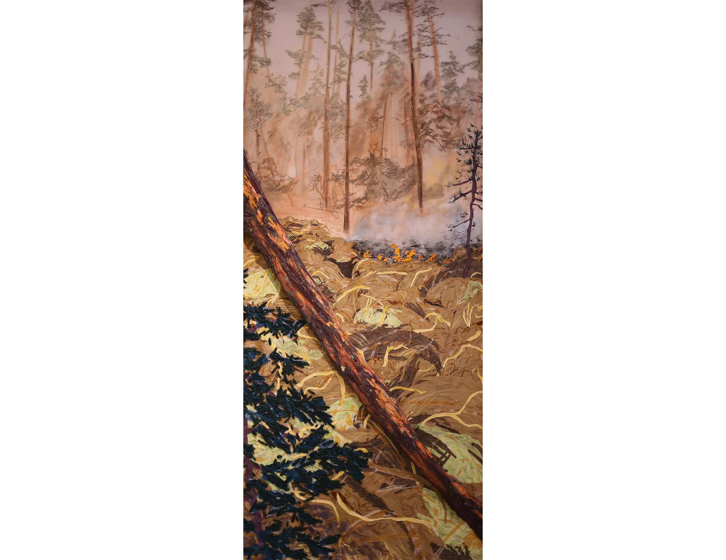 Embroidered tapestry, pastel, acrylic, oil on canvas, wire, printed image, epoxy resin. 7' x 30'